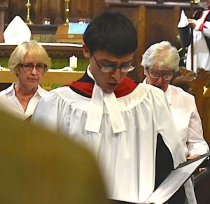 The splendid music was organised by Jamie Campbell as his ‘swan-song’ before he goes off to Aberdeen University to study Divinity next month. Jamie gathered together a choir of 18, who gave us Stainer’s Magnificat in F, Jamie’s own Nunc Dimitis in F and Stainer’s “God so loved the world”. The preces and responses were by Alan Knight.