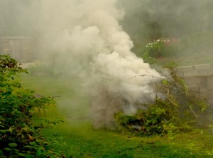 Today I decided to have a bonfire. We’ve accumulated quite a pile of garden rubbish this summer, but haven’t dared to have a bonfire as everything was so dry and one stray spark could have had rather serious consequences. Anyway, today is dry and still and so it seems the perfect opportunity to catch up. A big pile of garden rubbish isn’t, however, all that’s needed. Material for kindling and dry woody material for generating some heat are also required. Anyway it started smouldering gently, but without any great enthusiasm, as a result of the complete lack of air movement and I wasn’t sure whether or not it would actually take off.