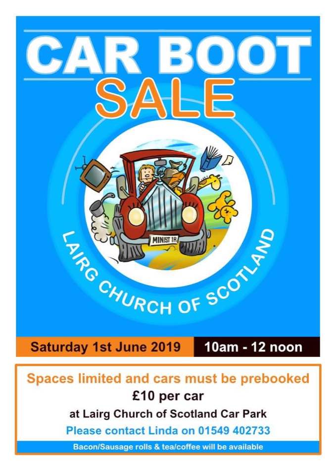 Lairg Car Boot Sale – Saturday 1st June 2019 29/05/2019 sheumais Events Saturday 1st June 10:00am – 12:00pm Car Boot Sale Church of Scotland, Lairg Spaces limited and cars must be booked at £10 per car Share this: Click to share on Facebook (Opens in new window) Facebook Click to share on X (Opens in new window) X Click to email a link to a friend (Opens in new window) Email More Click to print (Opens in new window) Print Like Loading...