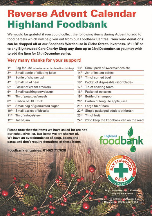 This Reverse Advent Calendar idea is a good way of helping those who are struggling over the winter, by gathering together items that the Food Bank is often short of, day by day throughout Advent.