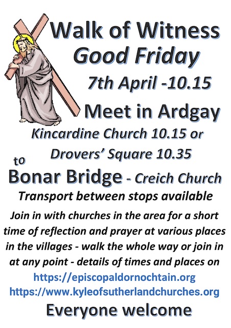 The walk will start in the car park adjacent to Kincardine Church in Ardgay and will end at Creich Church in Bonar Bridge, where there will be Hot Cross buns and tea/coffee available. The walk itself will commence at 10:15am and we should arrive at Creich Church by about 11:50am.
